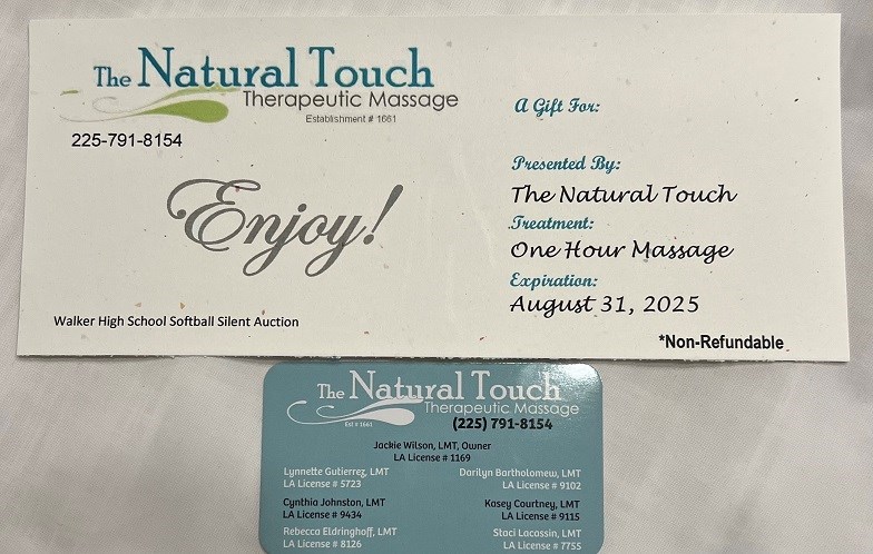 The winner of the item will receive a 1-hour message. The Natural Touch has been serving the Denham Springs community for over 25 years. To schedule your appointment. please call 225-791-8154 or you can visit their website at TheNaturalTouchMassage.com Item must be picked up at Walker High School. If you need to schedule a pickup, please send a message to 225-202-8018 or leave a message.
