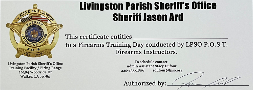 This certificate entitles the winner to a Firearms Training Day conducted by LPSO P.O.S.T. Firearm Instructors. To schedule contact: Stacy Defour 225-435-1806 or email sdufor@lspo.org Item must be picked up at Walker High School. If you need to schedule a pickup, please send a message to 225-202-8018 or leave a message.