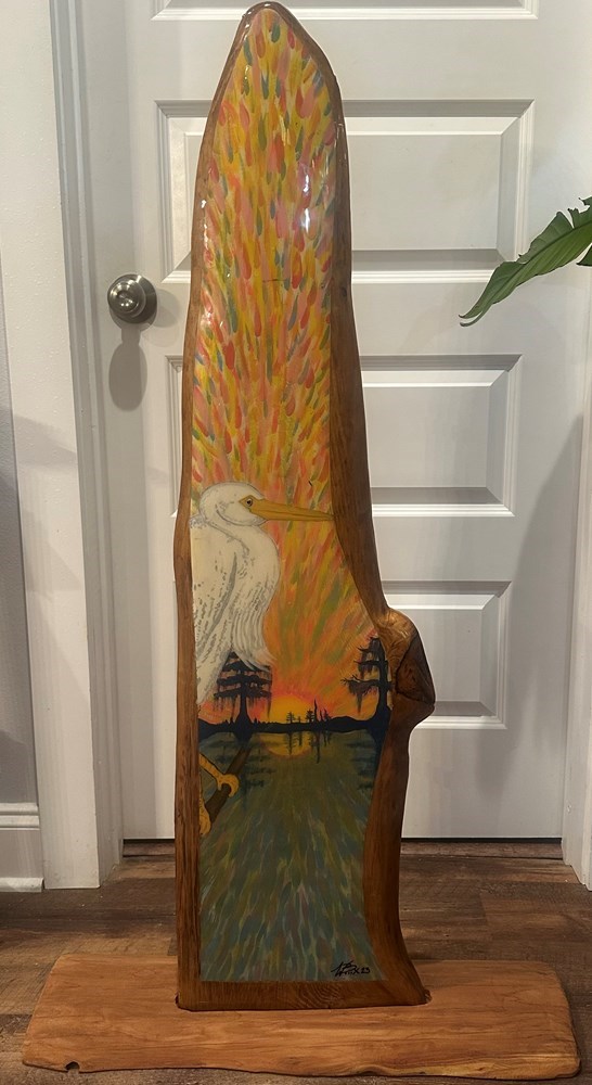 The Lake-Carved wood art piece. Wade Boudreaux Art exemplifies Creative art with a Cajun flair! Wade creates fine art, funky crafts and murals. His work is very versatile. Check out more at Wade Boudreaux Art. Take a look through pictures and videos. Call 225.205.9197 to commission a piece. If purchased online, please text 985-273-2235 to schedule a pickup at Walker High School.