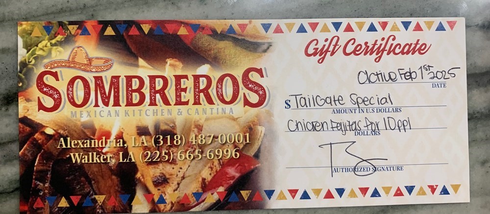 Sombreros Chicken Fajita Tailgate package for 10 If purchased online, please text 985-273-2235 to schedule a pickup at Walker High School.