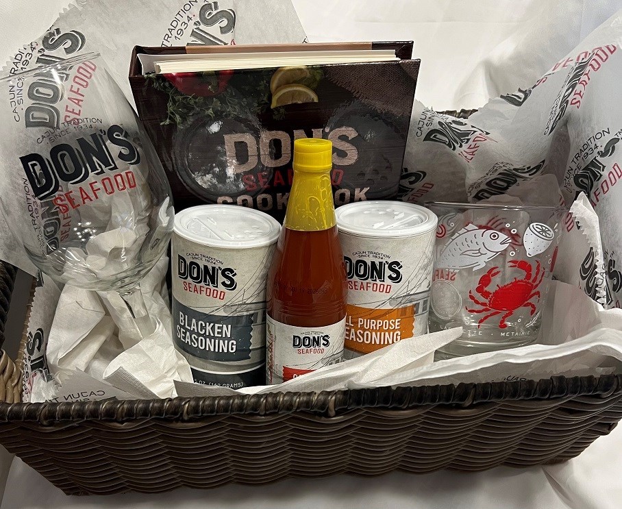 This gift basket includes a Don' Seafood Cookbook, Don's Blacken Seasoning, Don's All-Purpose Seasoning as well as a bottle of Hot Sauce. While dining at home you can enjoy your favorite beverages in the wine or rock's glass. Item must be picked up at Walker High School. If you need to schedule a pickup, please send a message to 225-202-8018 or leave a message.