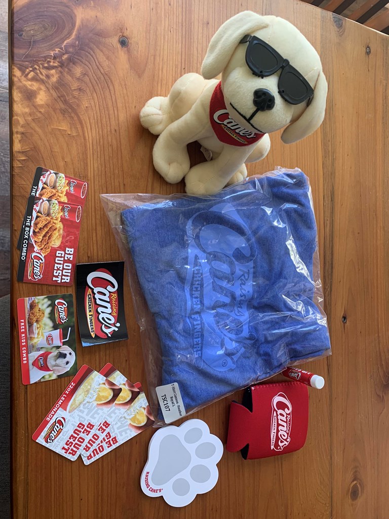 Canes Gift set- Cane's T-shirt, koozie, Cane's chapstick, Cane plushie, 1 kid's combo, 3-box combos, Cooler, and Magnet. If purchased online, please text 985-273-2235 to schedule a pickup at Walker High School.