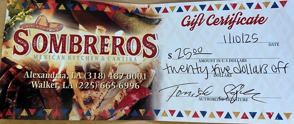 The winner of this gift certificate will receive a $25.00 gift certificate to be used with their next purchase. Item must be picked up at Walker High School. If you need to schedule a pickup, please send a message to 225-202-8018 or leave a message.